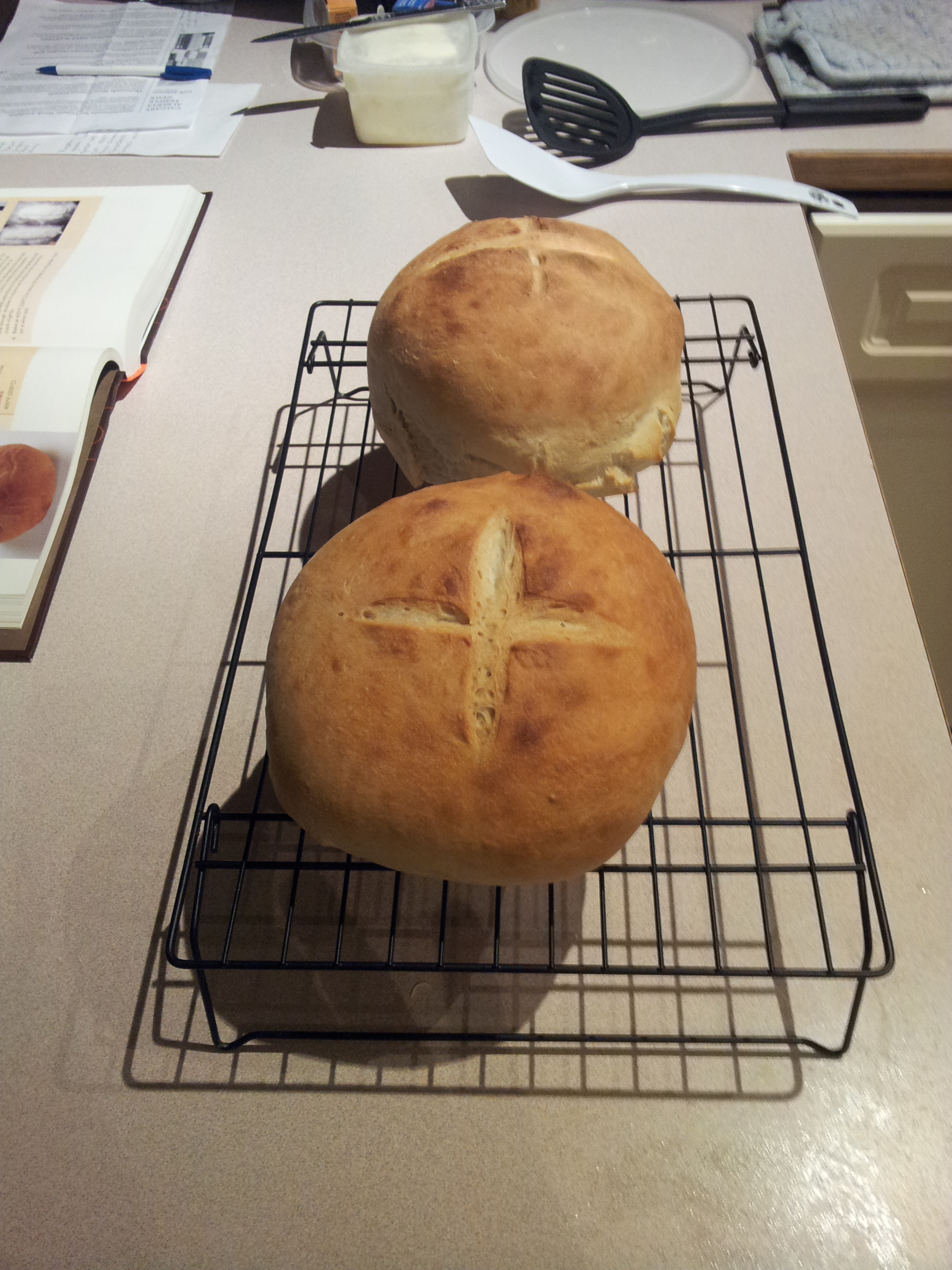 Divide the dough into two balls. Round them, place them on the sheet, and score the top with a cross. Proof until doubled in size. Bake at 400F (200C) until nice and golden brown (about 20 minutes).