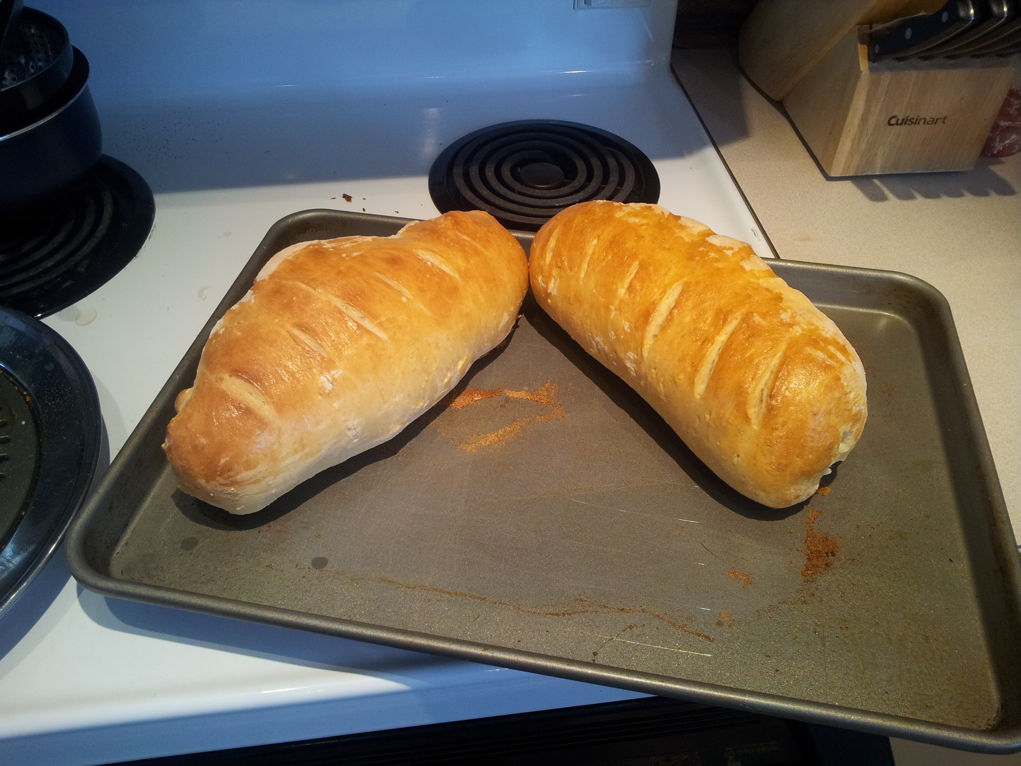 The first bread I tried was ciabatta, a classic Italian bread. What sets this bread apart is the olive oil. The dough is very sticky and should not be handled much, so getting a precise shape is difficult. It is also heavily dusted with flour. We brush a lot of it off before eating. This recipe makes three smaller loaves. I tried making two larger ones, but the dough was too heavy for the yeast. I got good rise while fermenting but nothing while proofing. You could easily make loaves small enough for turning into large sandwiches. The trouble is shaping the dough.