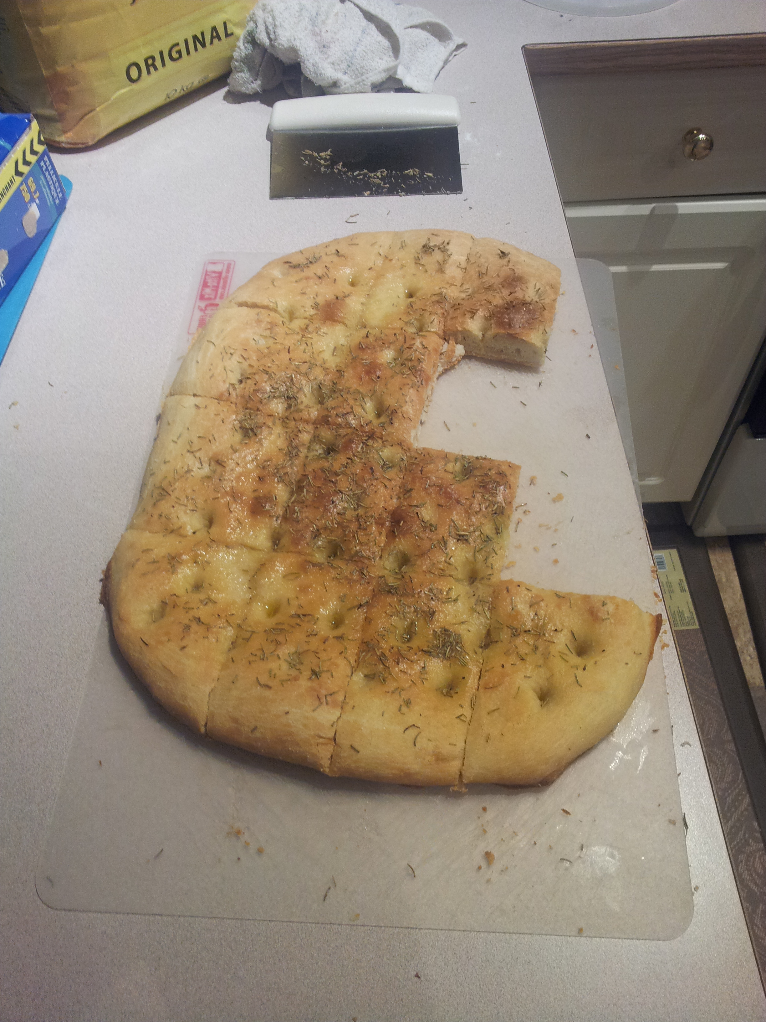 Next up, herb focaccia. This was not the light cake-like focaccia I’ve seen at the supermarket. This is a denser, tougher bread that appears to be more traditional. This would make killer bread sticks to eat with soup.
