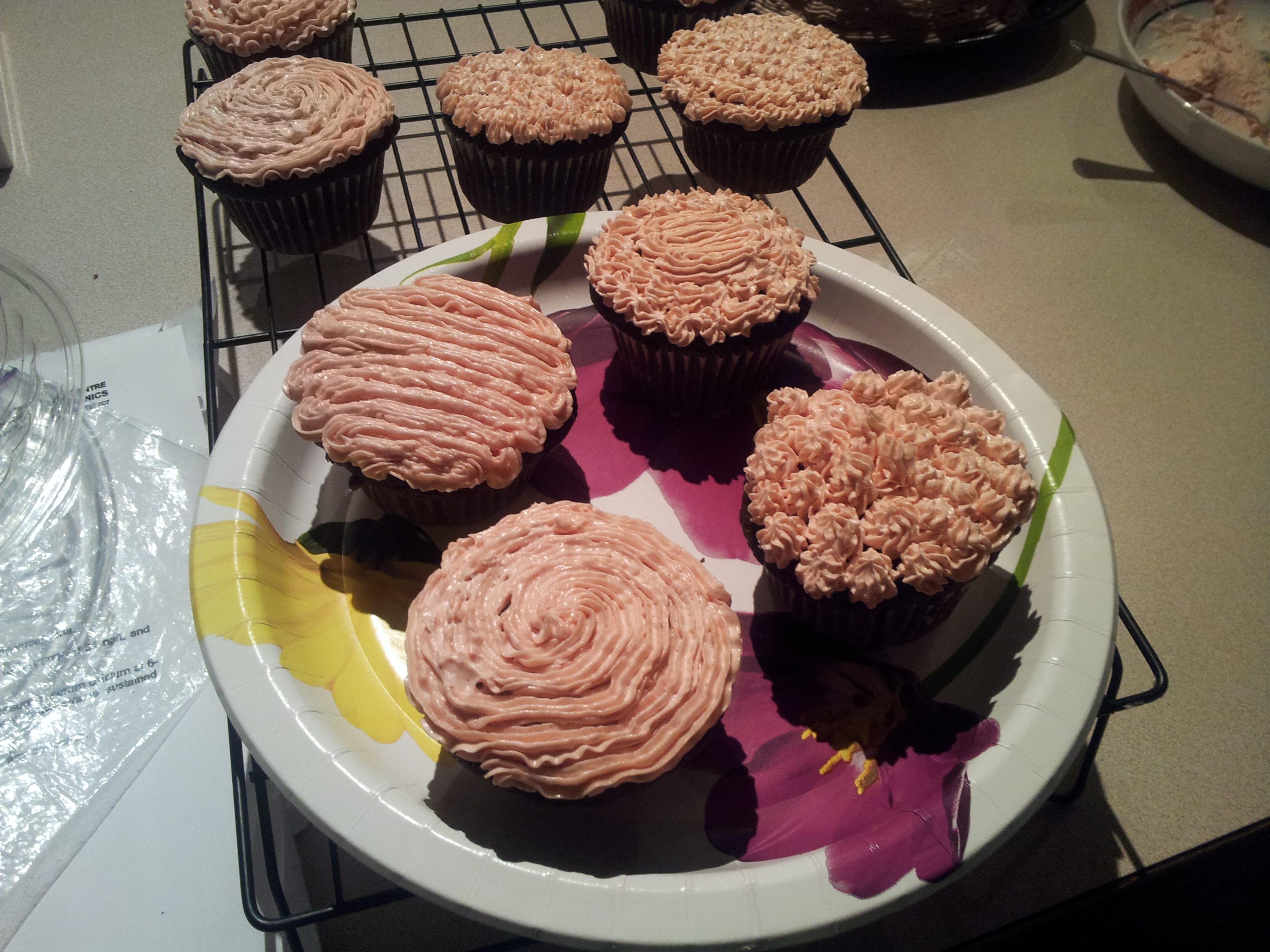 I only have two cupcake pans, so I made 2 dozen cupcakes and one 9″ cake. This cake is super moist, so be sure to line the bottom of your cake pan with parchment. I can’t get over how moist and delicious this cake is. Even days later it was perfect. And her buttercream recipe turned out awesome (though I used vanilla extract instead of vanilla bean). The secret I think is the paddle attachment phase at the end. The buttercream I made in the past was the same basic recipe, but it lacked the consistency that the beating step brings.