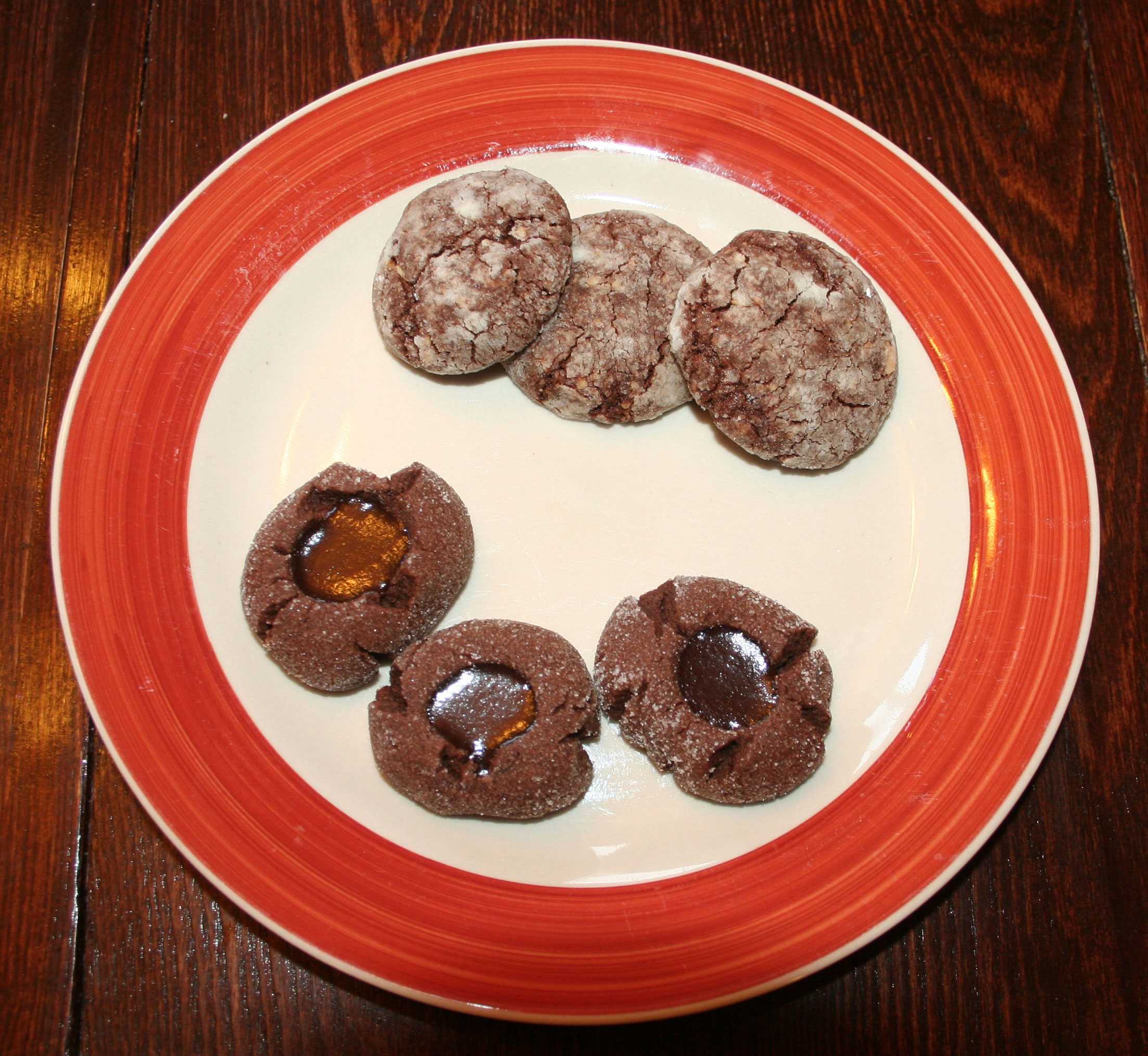 Made two different kinds of cookies today: Dark Chocolate Almond Crackles and Chocolate Thumbprints.