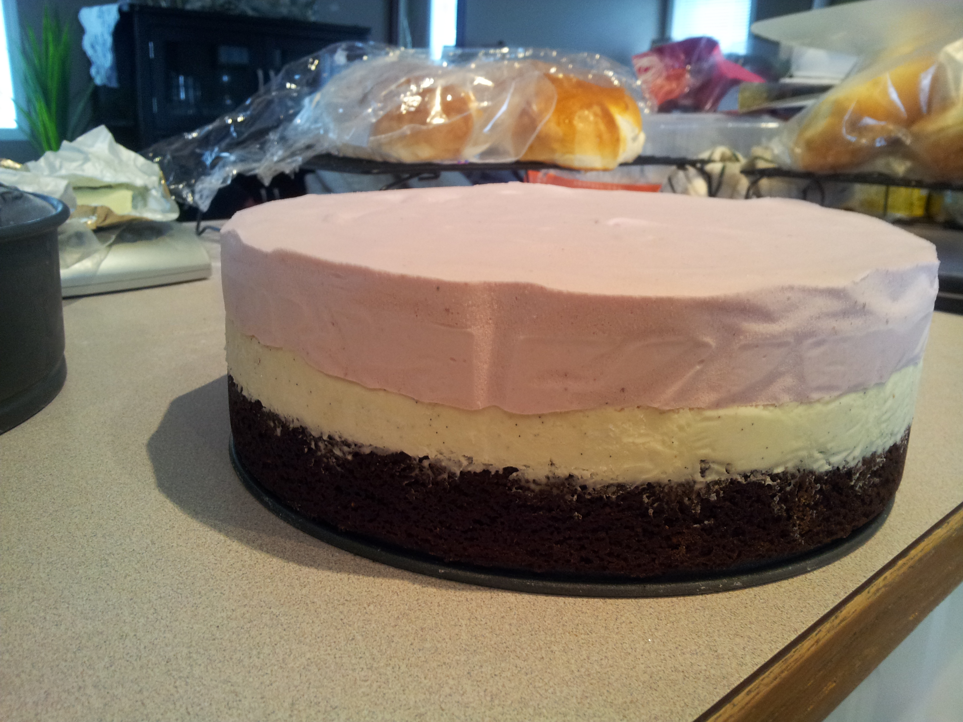 Tasty! I love strawberries, so the idea of a strawberry mousse was too much not to try. I don’t have 3-inch ring molds, so I decided to make a single large cake. I did some math and thought a 9-inch springform would be enough, but not quite. Next time I’ll use my 10-inch pan; I’m confident it will contain it all. I didn’t bother with the ganache topping this time. We had lots of homemade chocolate sauce set aside for ice cream.