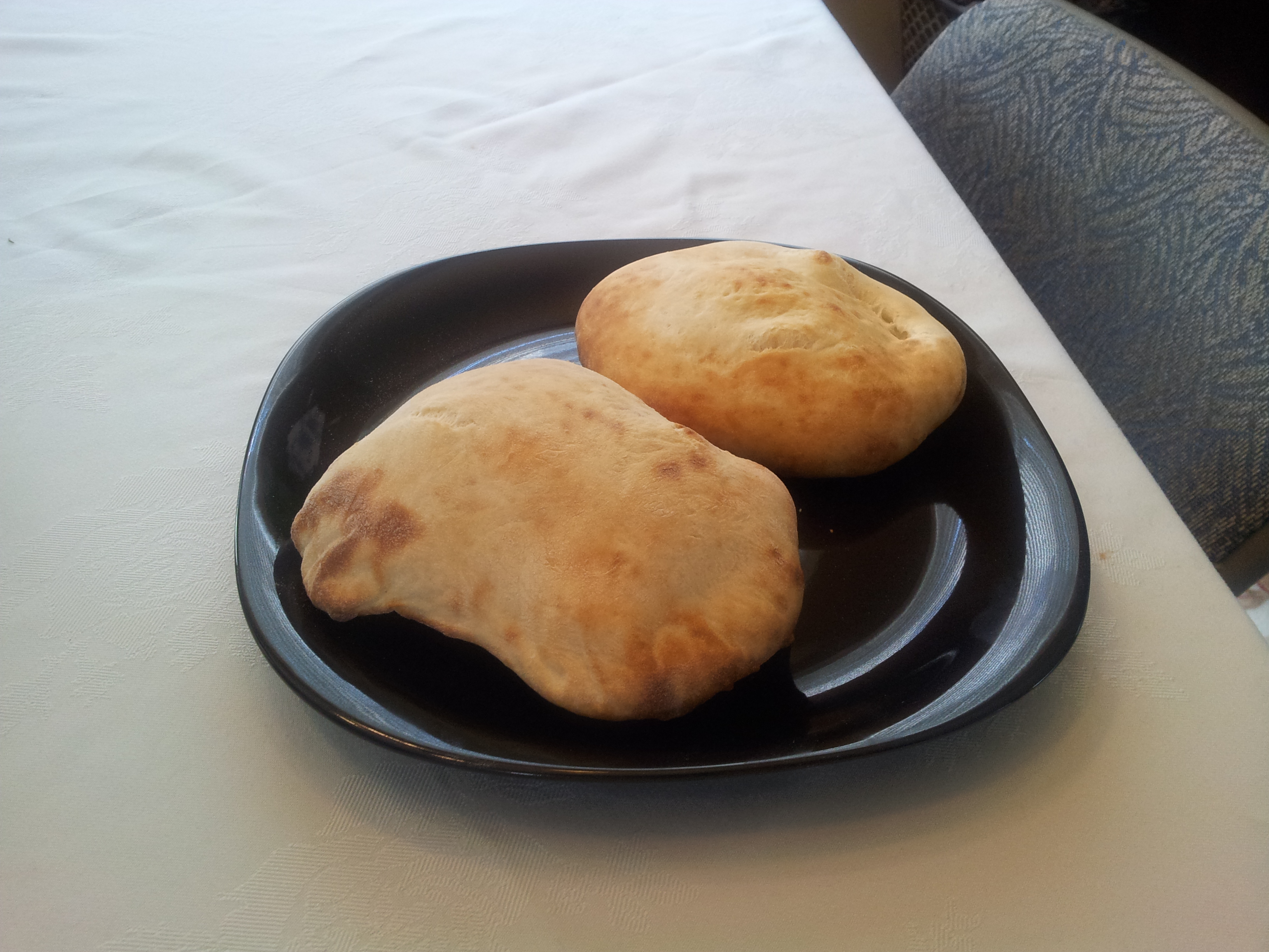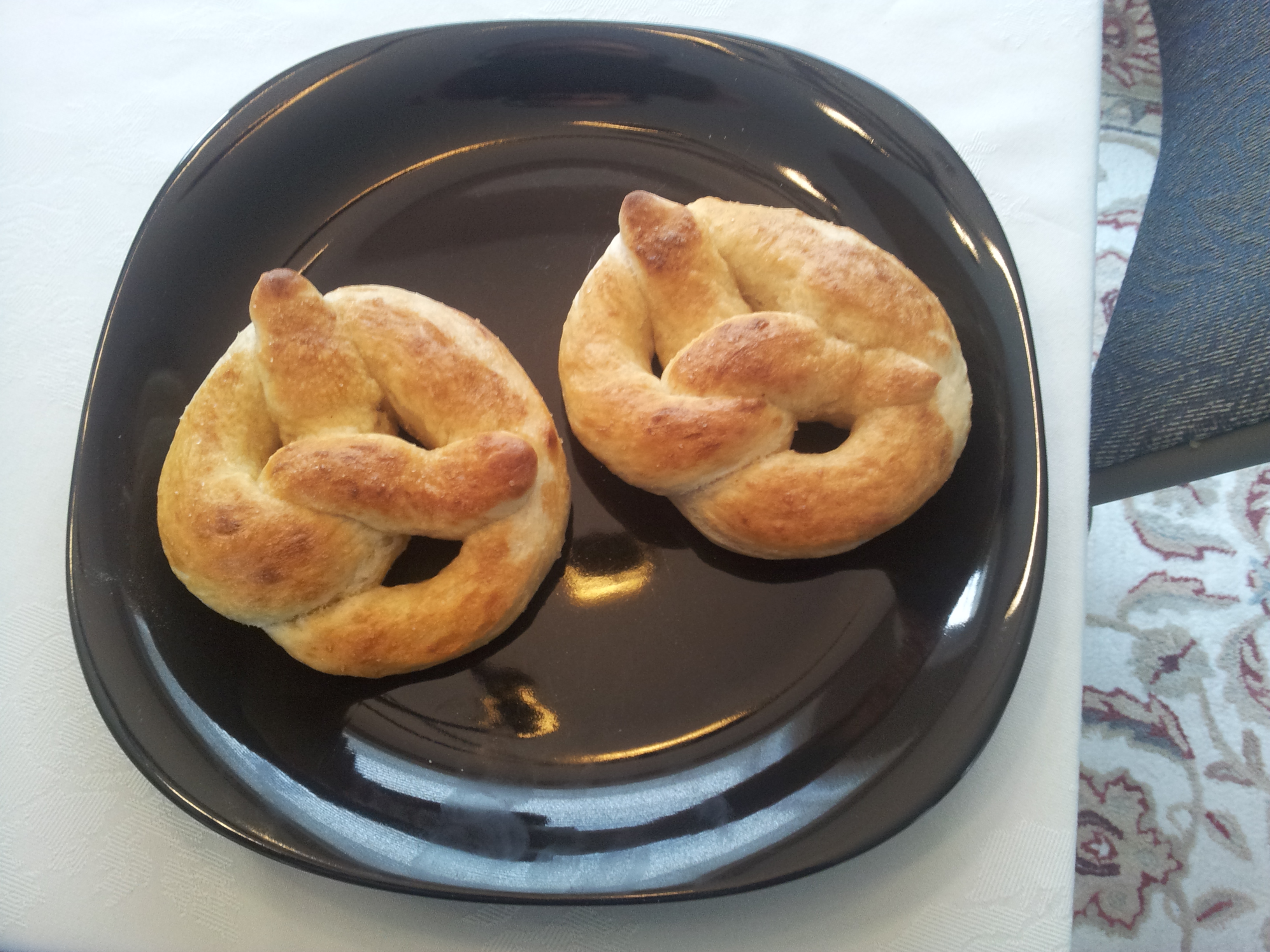 I made soft pretzels and pita bread today. The pretzels don’t quite taste like pretzels I’ve had in the past, but they were still delicious. The pita bread turned out really well for a first try. The pockets formed beautifully. I did half directly on the baking stone and half on a dry baking sheet. They both worked out great. I didn’t have the whole wheat flour for the pita, but the all-white-flour version worked out just fine. The below recipes come from the Gisslen book .